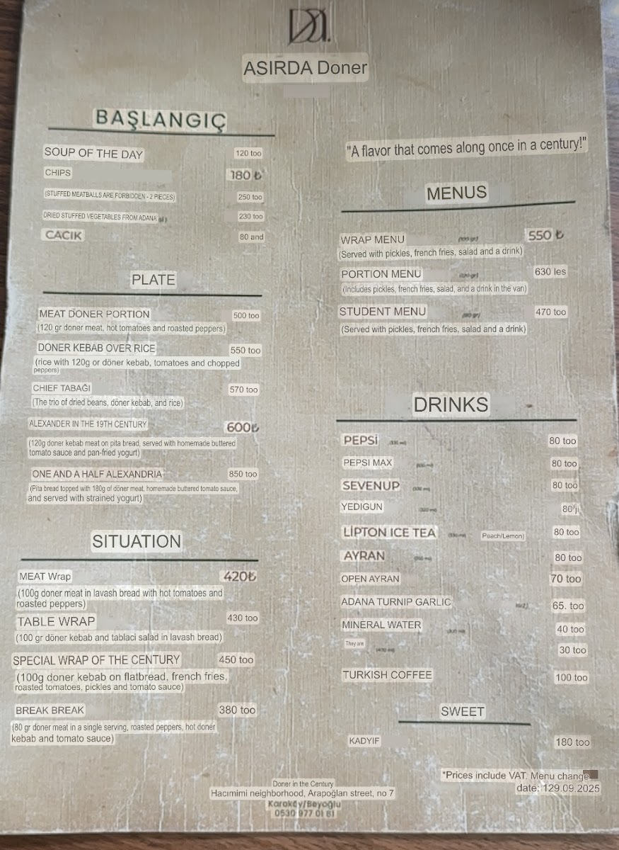 Asırda Döner Karaköy Menu